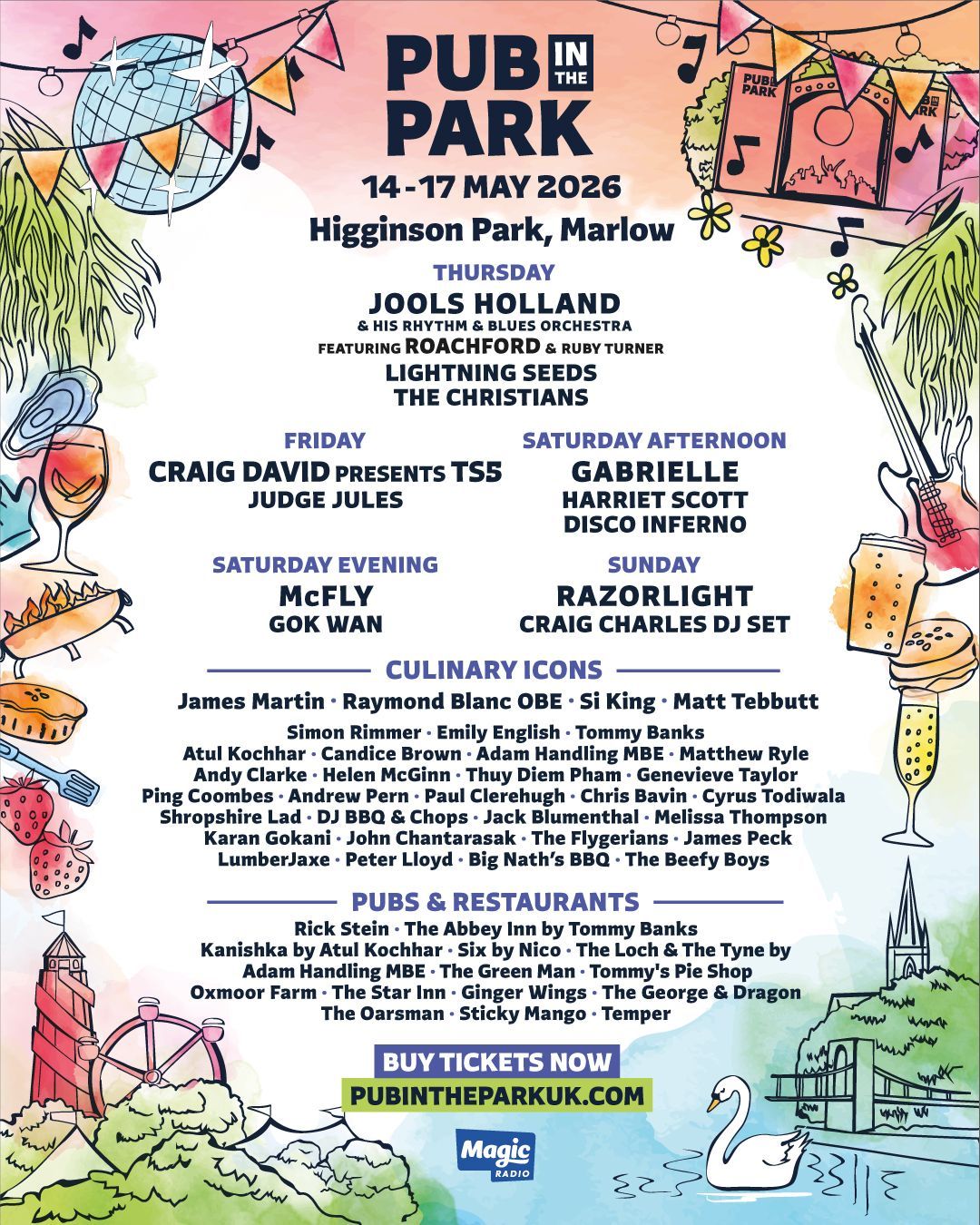 And don’t forget your dancing shoes as Pub in the Park, Marlow has an exceptional line up of performers ready to deliver an epic festival experience. Jools Holland and his Rhythm & Blues Orchestra, Craig David, Gabrielle, McFly and Razorlight are amongst just some of the top names announced to perform live for guests this year.